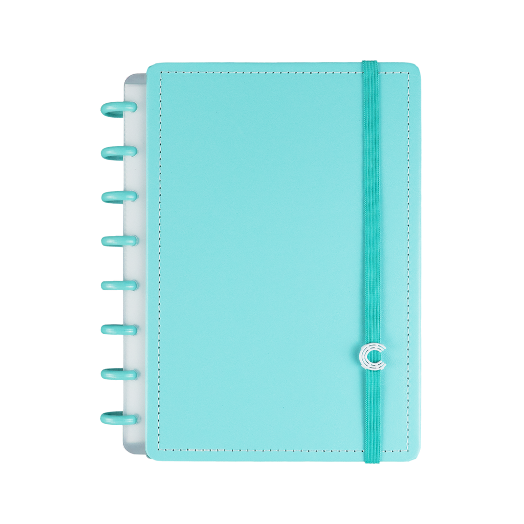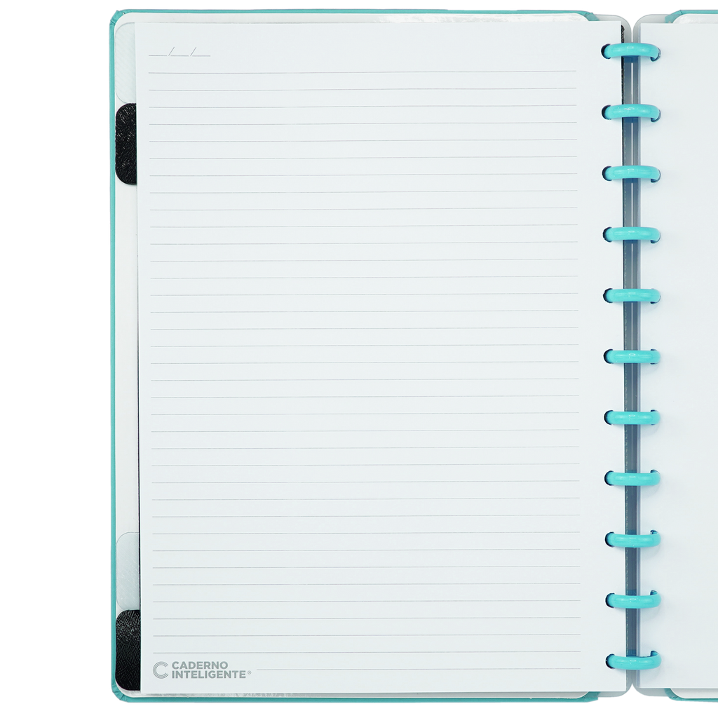 -A5, Médio ou Grande: Capa e contracapa rígidas, 01 bolsa plástica, 01 folha de instrução de uso e manuseio, com refis e acessórios da marca disponíveis no verso, 01 folha de identificação com calendário no verso, 04 divisórias com abas para identificação, 80 folhas offset 90g (60 folhas pautadas e 20 folhas lisas brancas para impressão), 01 suporte com elástico para 01 caneta ou 01 lápis e discos M + elástico.