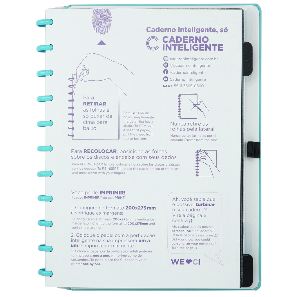 -Inteligine: Capa e contracapa rígidas, 01 folha de instrução de uso e manuseio, com refis e acessórios da marca disponíveis no verso, 01 folha de identificação com calendário no verso, 50 folhas Lisas Offset 120g e 01 suporte com elástico para 01 caneta ou 01 lápis.