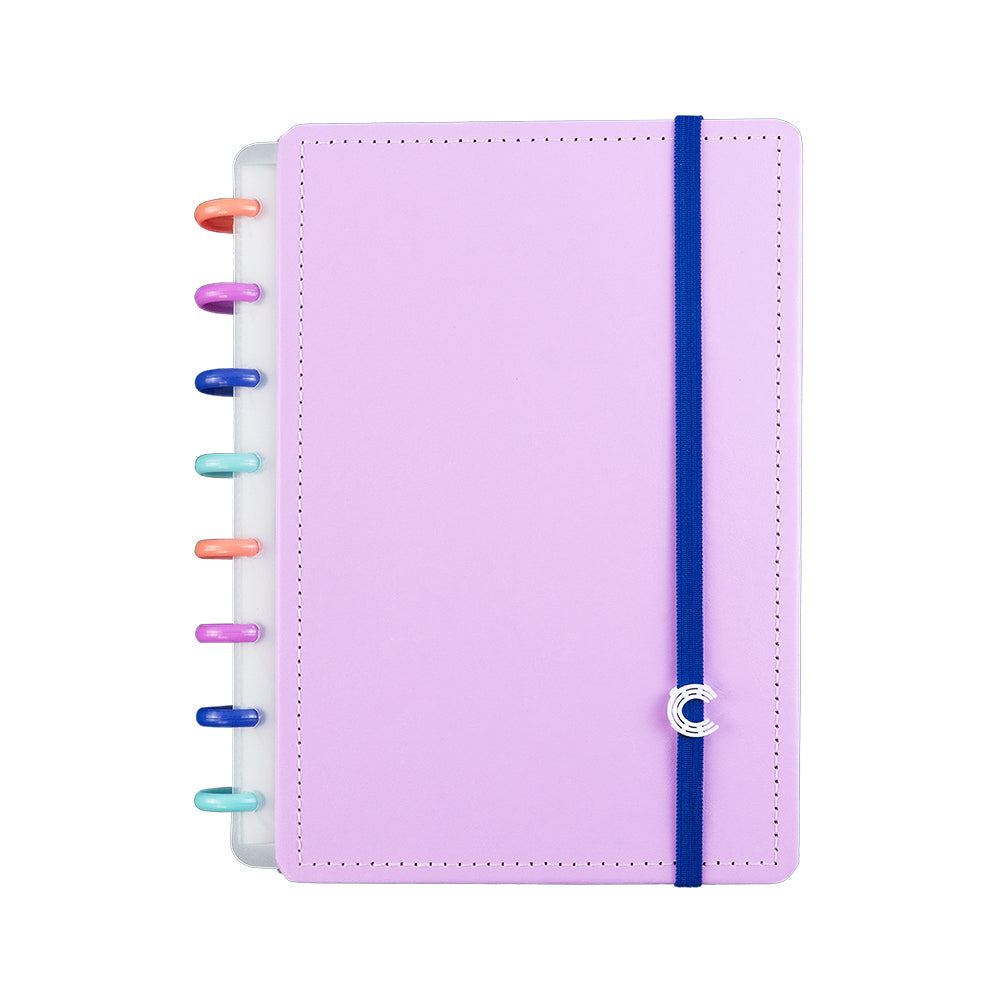 -A5, Médio ou Grande: Capa e contracapa rígidas, 01 bolsa plástica, 01 folha de instrução de uso e manuseio, com refis e acessórios da marca disponíveis no verso, 01 folha de identificação com calendário no verso, 04 divisórias com abas para identificação, 80 folhas offset 90g (60 folhas pautadas e 20 folhas lisas brancas para impressão), 01 suporte com elástico para 01 caneta ou 01 lápis e discos M + elástico.