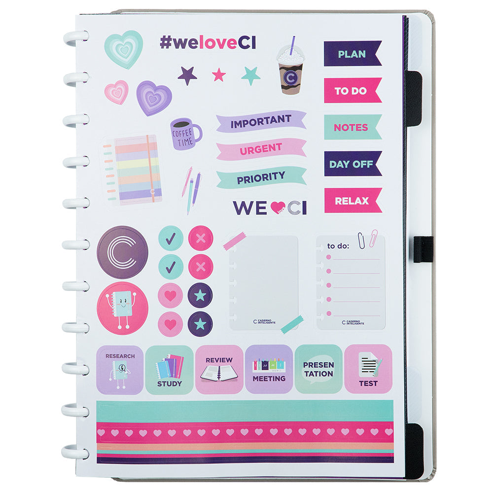 -Inteligine: Capa e contracapa rígidas, 01 folha de adesivos, 01 folha de instrução de uso e manuseio, com refis e acessórios da marca disponíveis no verso, 01 folha de identificação com calendário no verso, 50 folhas Lisas Offset 120g e 01 suporte com elástico para 01 caneta ou 01 lápis.