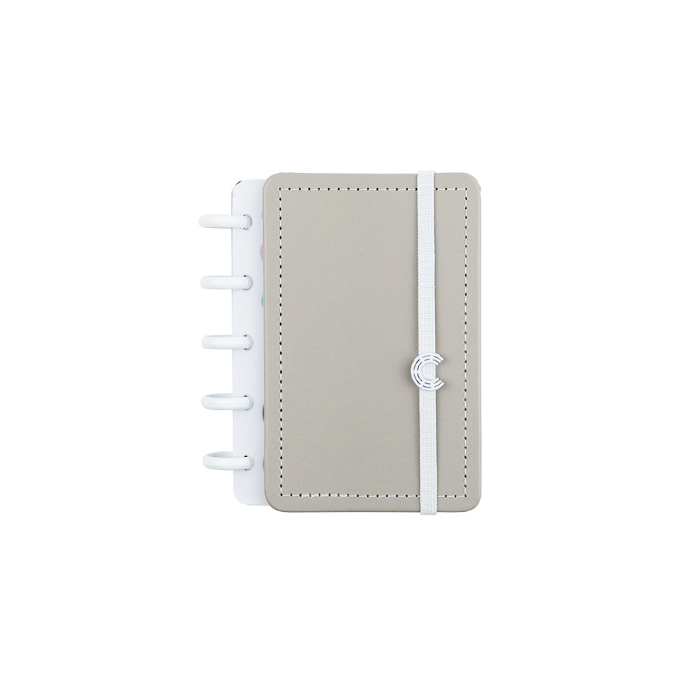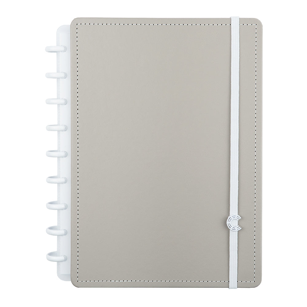 -A5, Médio ou Grande: Capa e contracapa rígidas, 01 folha de adesivos, 01 bolsa plástica, 01 folha de instrução de uso e manuseio, com refis e acessórios da marca disponíveis no verso, 01 folha de identificação com calendário no verso, 04 divisórias com abas para identificação, 80 folhas offset 90g (60 folhas pautadas e 20 folhas lisas brancas para impressão), 01 suporte com elástico para 01 caneta ou 01 lápis e discos M + elástico.