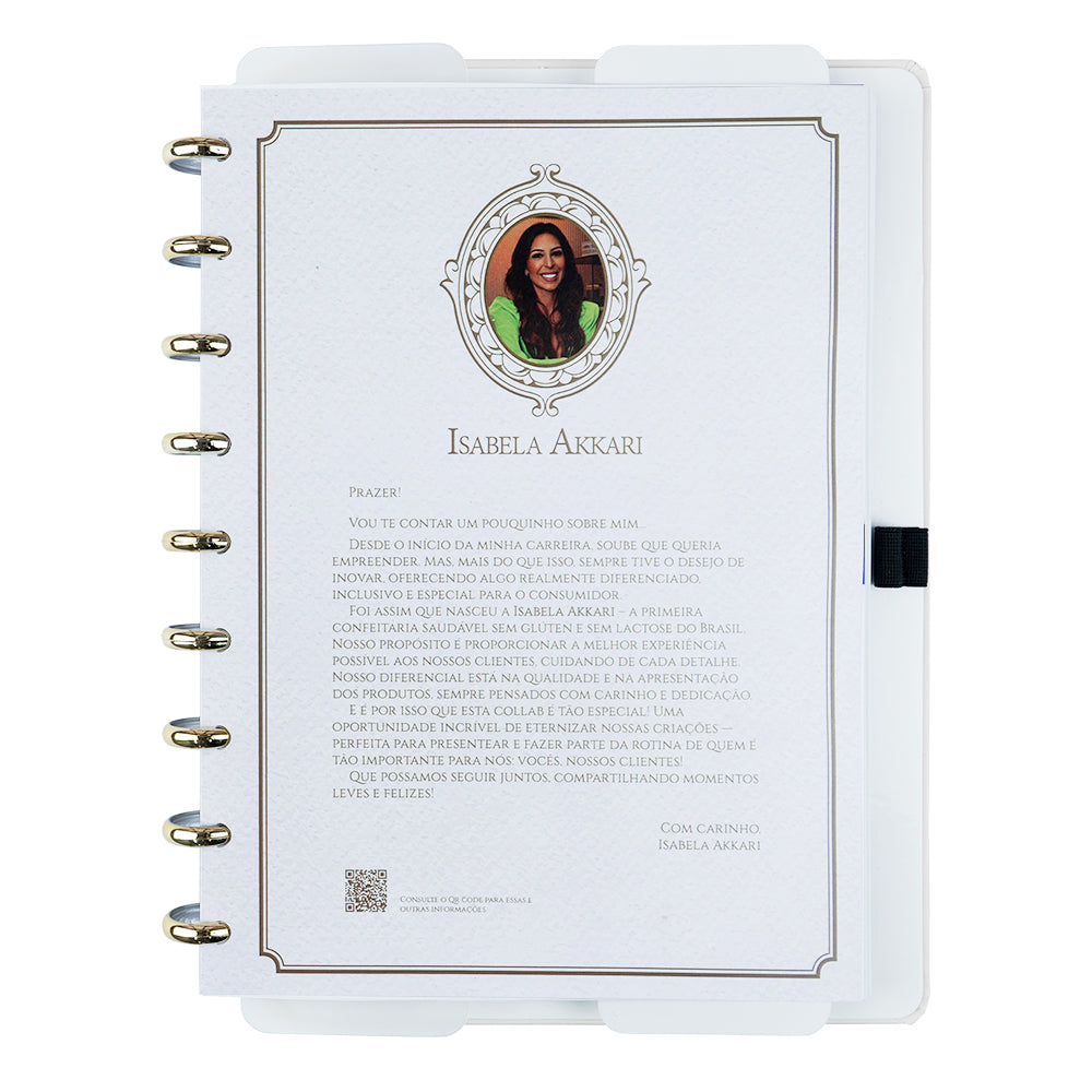 A5 e Médio: Capa e contracapa rígidas, 01 folha de adesivos exclusivos, 01 bolsa plástica, 01 folha de instrução de uso e manuseio, com refis e acessórios da marca disponíveis no verso, 01 folha de identificação com calendário no verso, 01 folha de apresentação Isabela Akkari, 01 folha de receita Isabela Akkari, 01 folha para anotação de receita, 04 divisórias com clean (02 transparentes e 02 branco gelo) abas para identificação localizadas nas partes superior e inferior, 80 folhas offset 90g (60 folhas pautadas e 20 folhas lisas brancas para impressão), 01 suporte com elástico para 01 caneta ou 01 lápis e discos M + elástico.