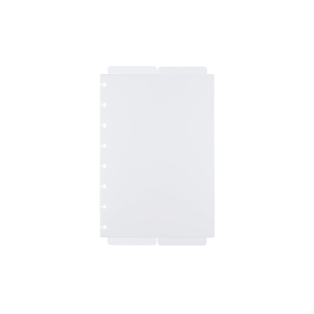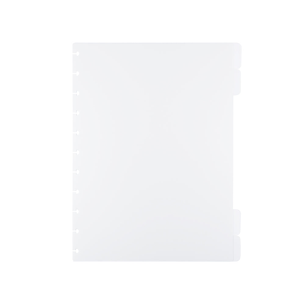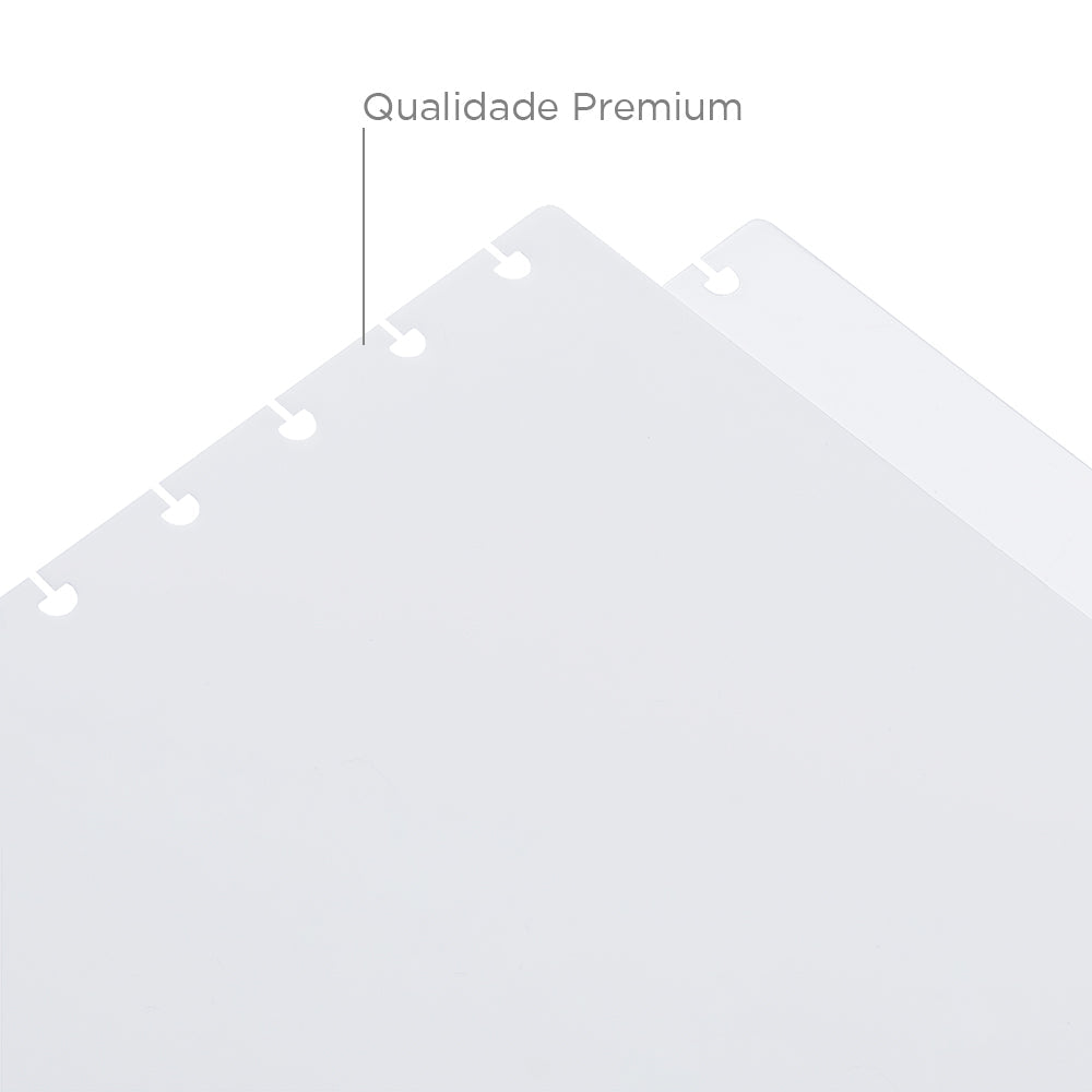Disponível nos tamanhos A5, Médio e Grande, contendo 4 divisórias (sendo 02 transparentes e 02 branco gelo) com abas para identificação.