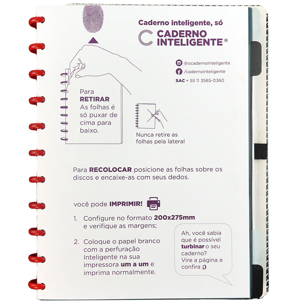 -Inteligine: Capa e contracapa rígidas, 01 folha de instrução de uso e manuseio, com refis e acessórios da marca disponíveis no verso, 01 folha de identificação com calendário no verso, 50 folhas Lisas Offset 120g e 01 suporte com elástico para 01 caneta ou 01 lápis.