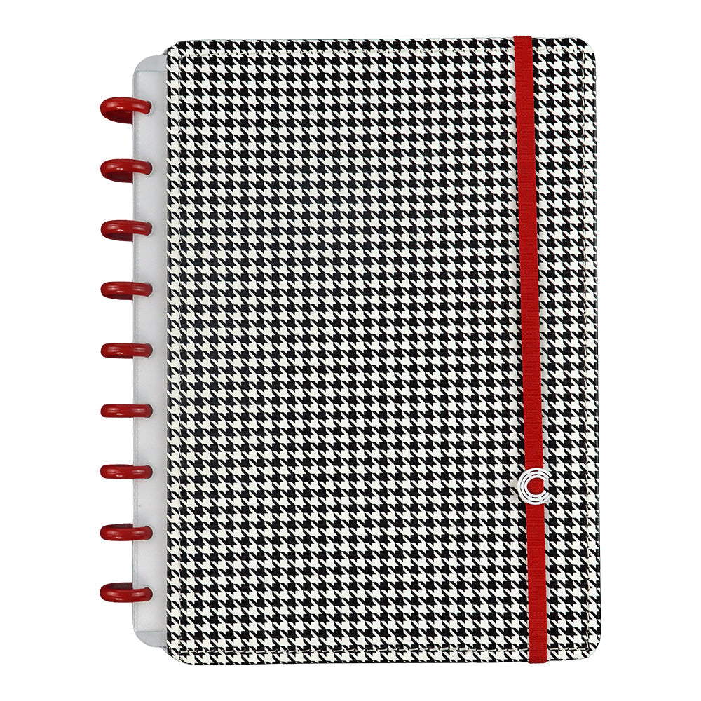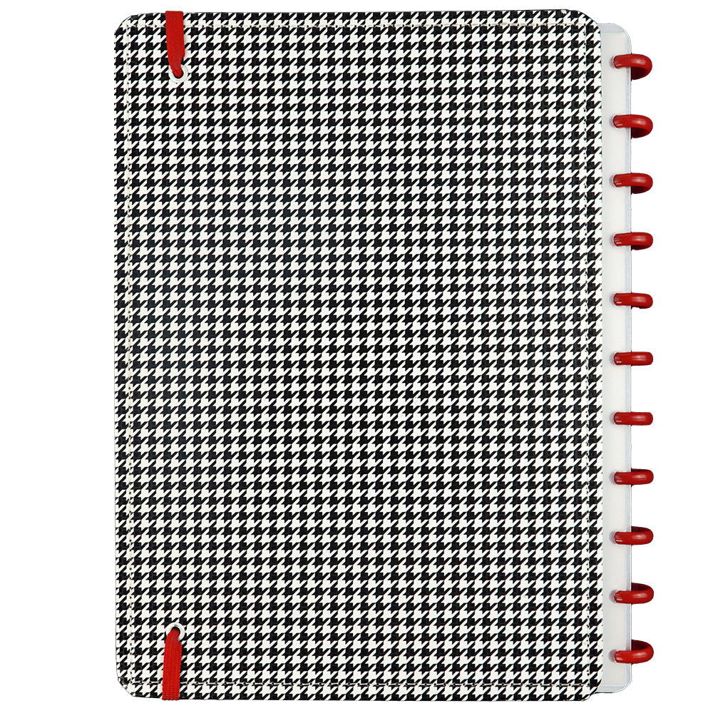 -A5, Médio ou Grande: Capa e contracapa rígidas, 01 bolsa plástica, 01 folha de instrução de uso e manuseio, com refis e acessórios da marca disponíveis no verso, 01 folha de identificação com calendário no verso, 04 divisórias com abas para identificação, 80 folhas offset 90g (60 folhas pautadas e 20 folhas lisas brancas para impressão), 01 suporte com elástico para 01 caneta ou 01 lápis e discos M + elástico.